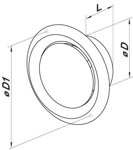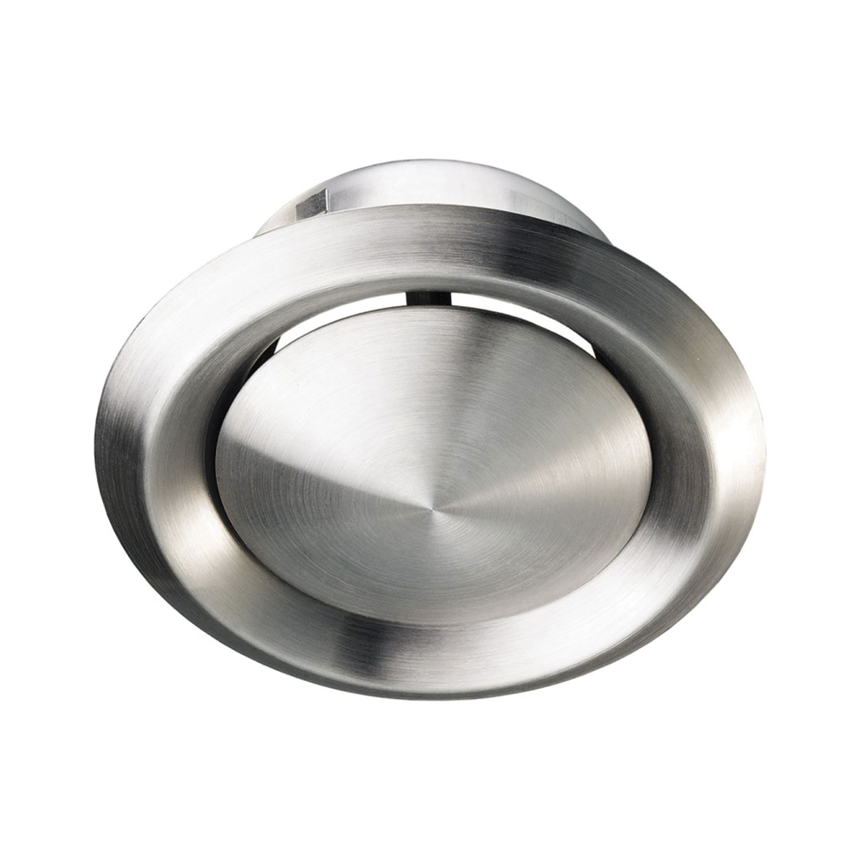 Valvole di mandata e ripresa in acciaio inox per muro o controsoffitto, con regolazione del flusso d'aria e flangia per fissaggio del tubo circolare.