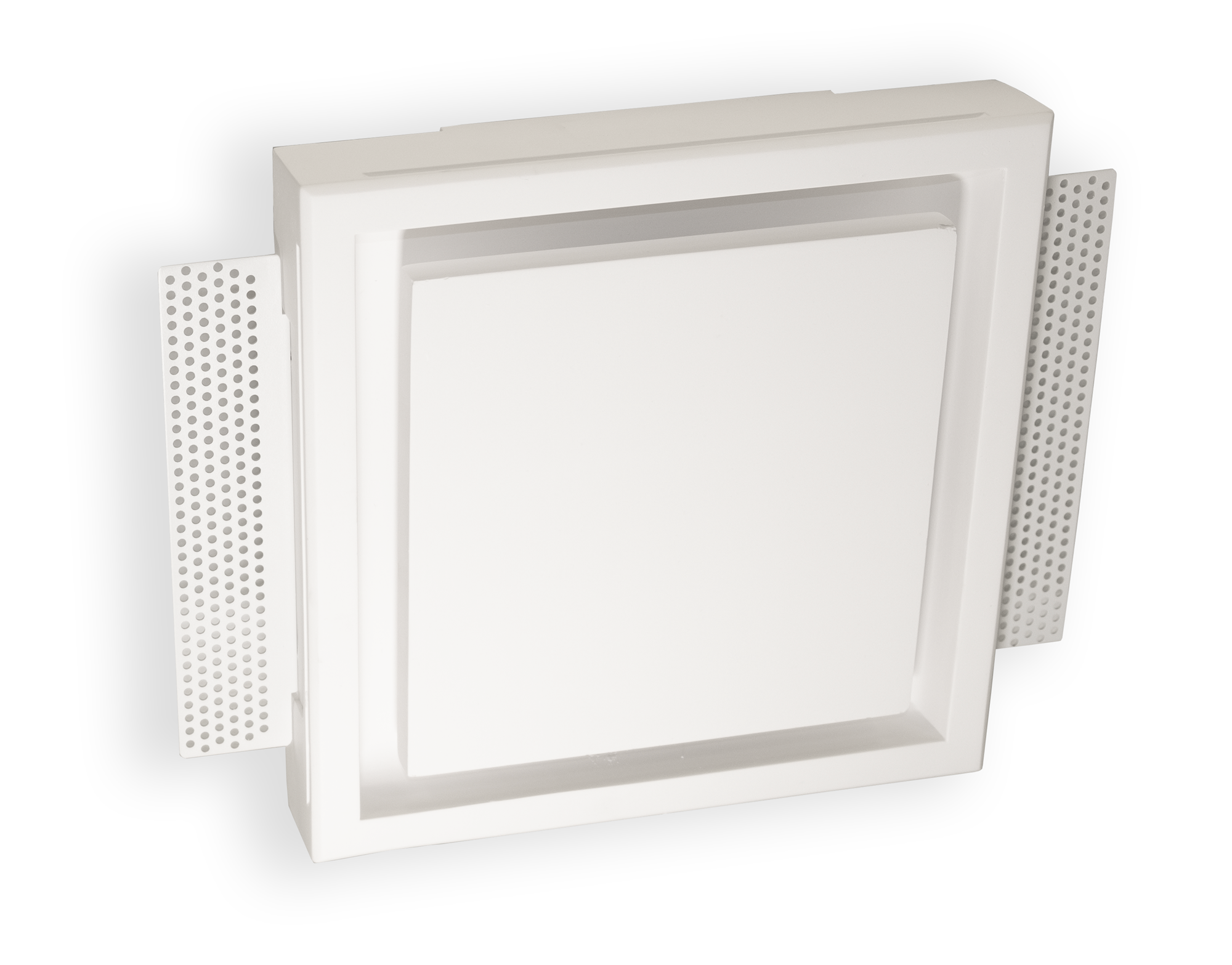Diffusori in gesso con forma circolare o quadrata a scomparsa per installazione su controsoffitti in cartongesso.