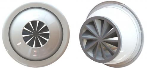 Il deflettore swirl applicato nella parte posteriore del diffusore ad ugelli genera un moto di rotazione che aumenta l'induzione e riduce il lancio del diffusore del 40% ed è particolarmente indicato per l'immissione di portate aria elevate in ambienti di medie dimensioni prevenendo l'insorgere di correnti d'aria sensibili nella zona occupata.