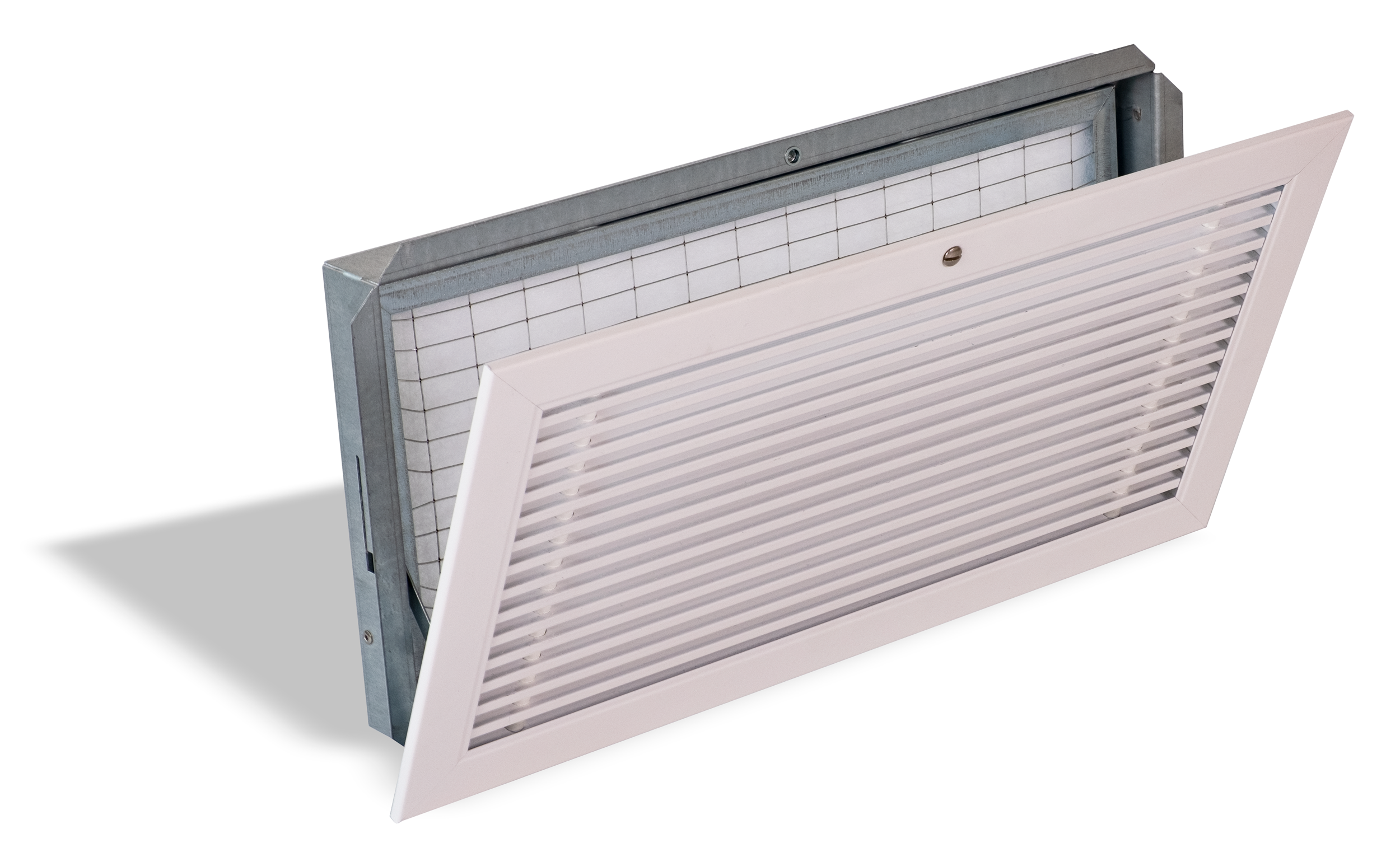 Griglie per la ripresa dell’aria costruite a barre orizzontali fisse in alluminio con profili a deflessione 0°, con l’inserimento di uno speciale profilo o controtelaio che permette l’alloggiamento di un filtro piano per polveri grossolane e fini.