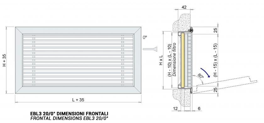 EBL3 20/0°: griglia con speciale controtelaio fissato con cerniere alla cornice della griglia per consentire un'agevole manutenzione del filtro. La chiusura avviene mediante meccanismo a vite.