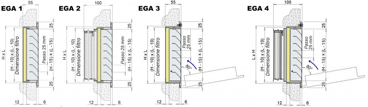 EGA4: griglia con serranda e speciale controtelaio fissato con cerniere alla cornice della griglia per consentire un'agevole manutenzione del filtro.