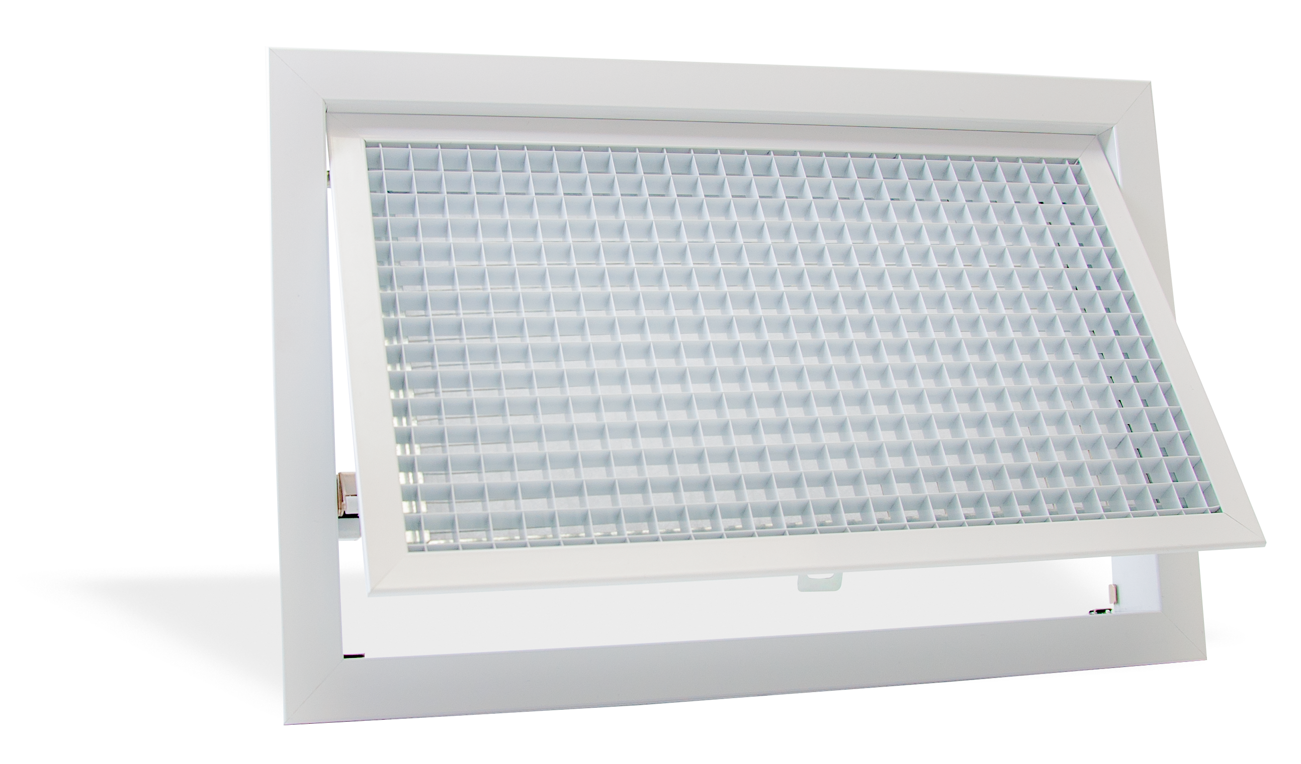 Griglia di ripresa a maglia quadra 13x13 mm da controsoffitto, con doppia cornice (interna da 15 mm) ad apertura a cerniere e sistema push-pull per l'agevole alloggiamento e la sostituzione del filtro.