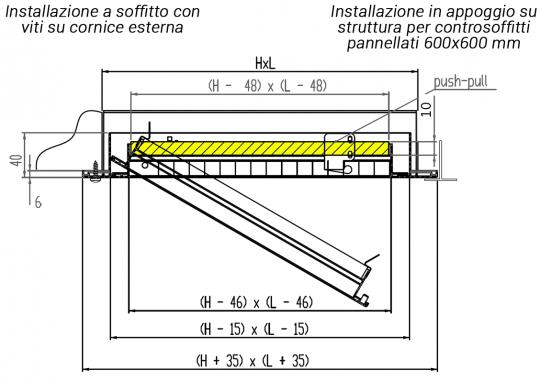 L'installazione viene eseguita fissando il telaio esterno della griglia al muro mediante viti o in appoggio su struttura per controsoffitti pannellati 600x600 mm.