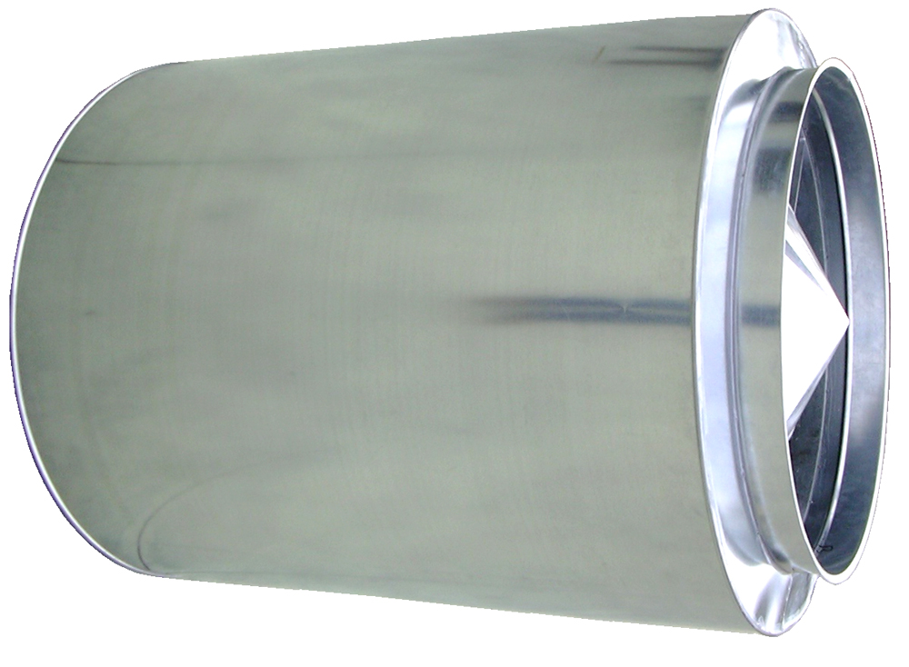 Silenziatore circolare per il controllo del rumore negli impianti di riscaldamento, condizionamento e ventilazione, con ogiva centrale.