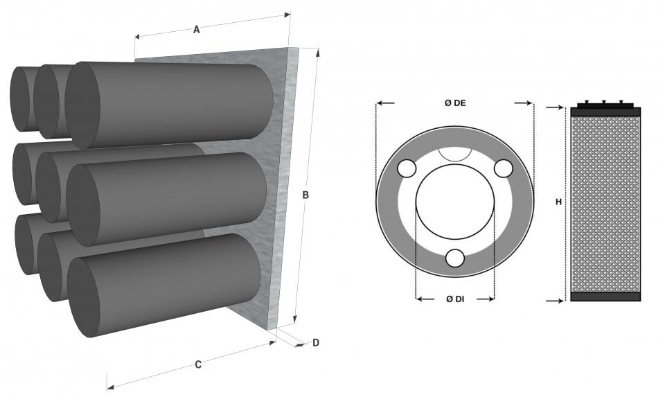 Filtri adsobitori a cartucce cilindriche contenenti carbone vegetale in granulo.
