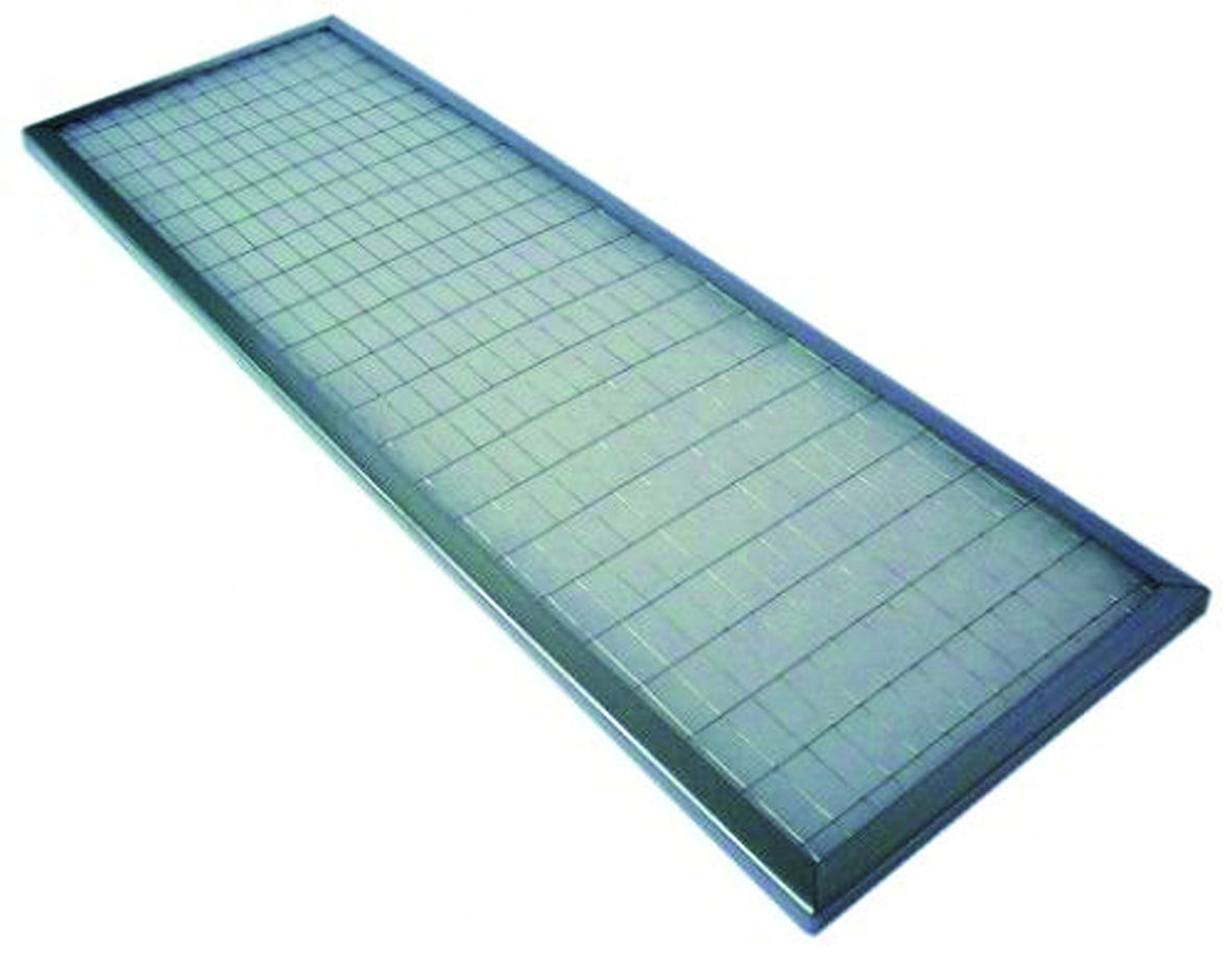 Cella filtrante piana sintetica per ventilconvettori, con telaio di supporto sezione ad U in acciaio zincato e doppia rete in filo zincato elettrosaldato per contenimento tessuto filtrante in fibra di poliestere.