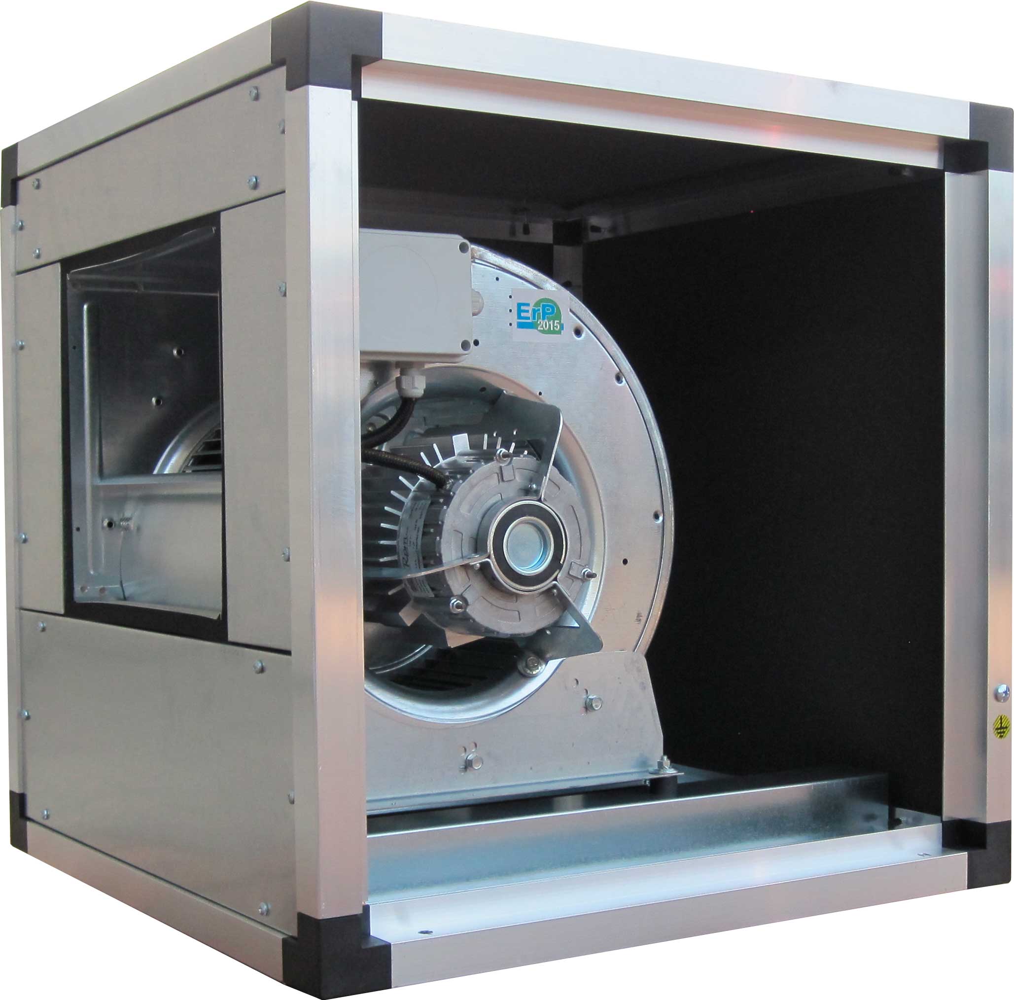 Temperatura di esercizio -20° +60°C,, porta di ispezione lato motore con chiusura a norme CE. Ventilatore del tipo centrifugo a doppia aspirazione del tipo direttamente accoppiato, montato su supporti antivibranti in gomma, giranti a pale curve avanti. Motore in esecuzione monofase 230V o trifase 400V, direttamente accoppiato, protezione IP54, classe F, conforme ErP.