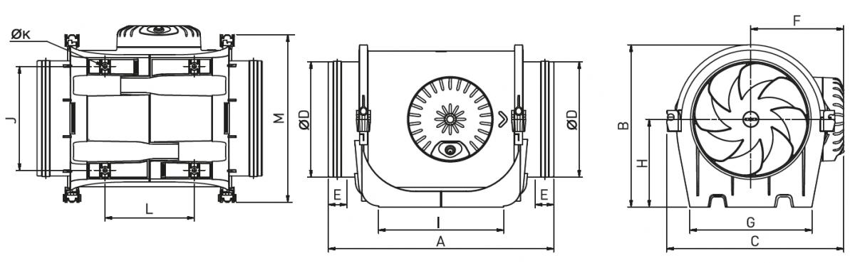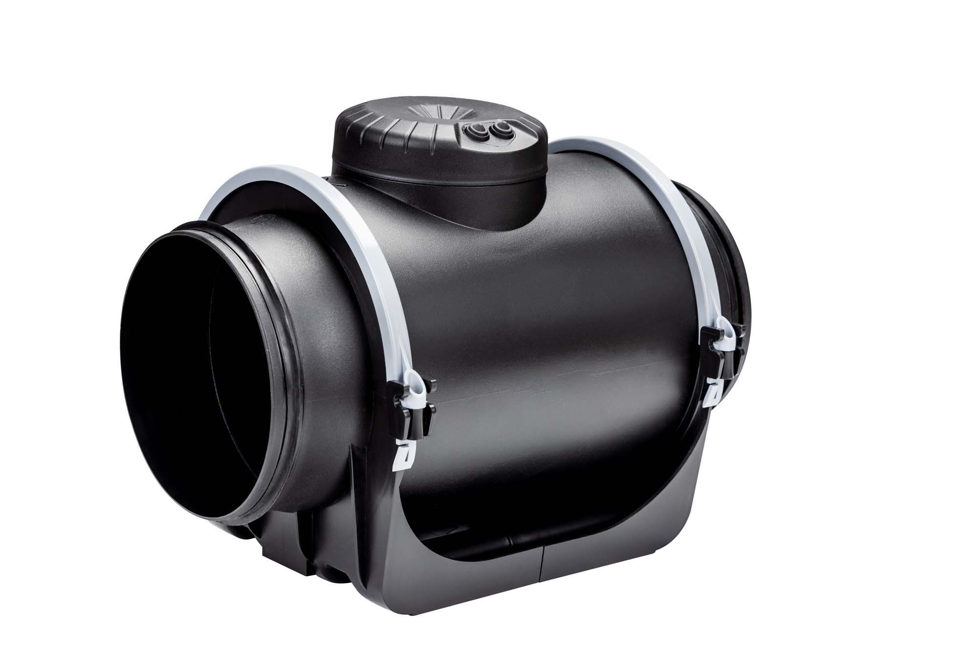 Ventilatore da condotto circolare, con scatola morsettiera esterna, involucro smontabile e motore regolabile, alimentazione 220-240V 50/60Hz.