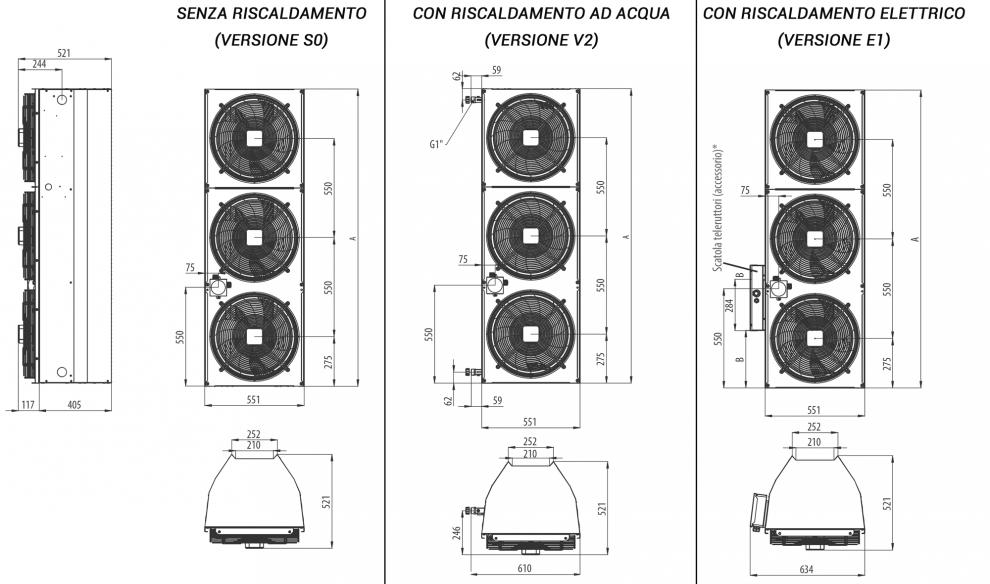 -Riscaldamento ad acqua (V2), elettrico (E1) o senza riscaldamento (S0)
