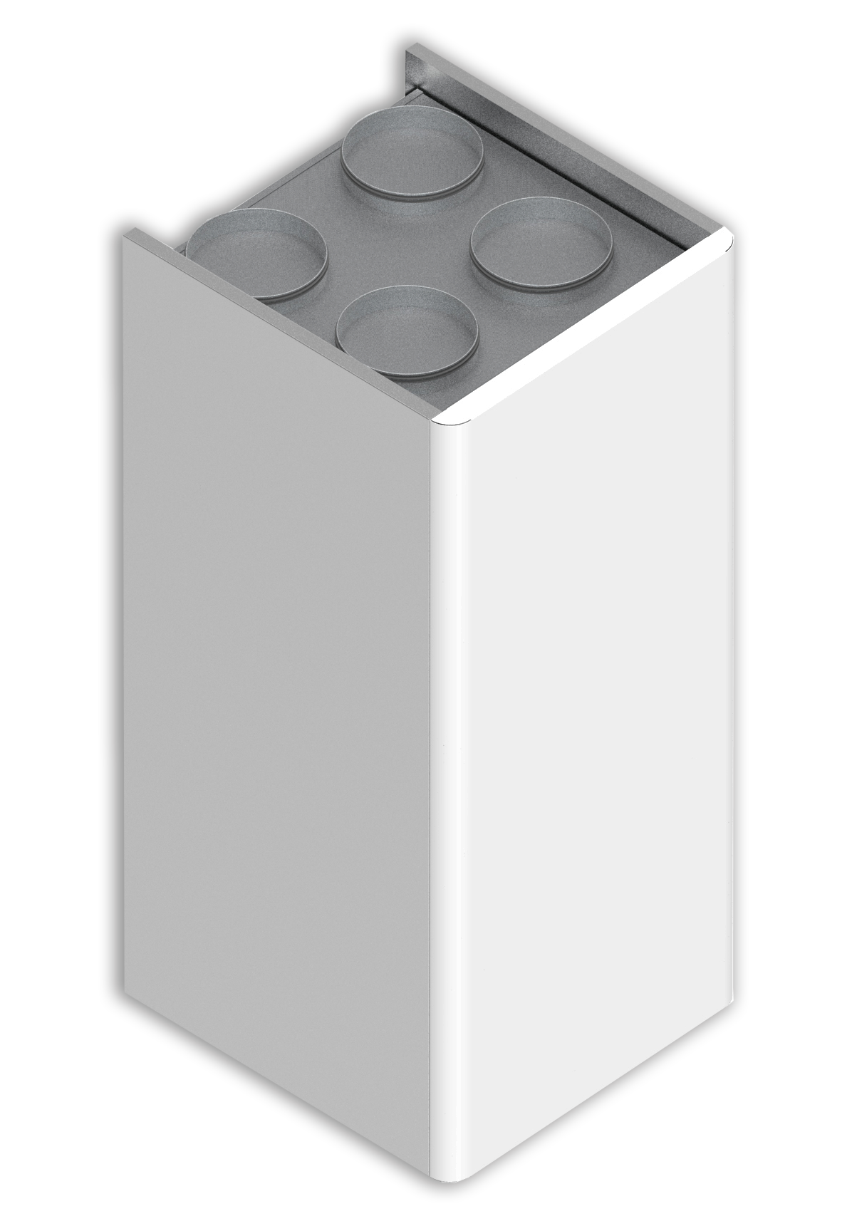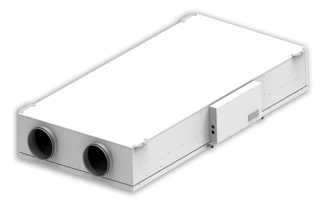 Unità di ventilazione con recupero di calore ad altissimo rendimento, dimensioni compatte per installazione a soffitto, a muro o a pavimento.