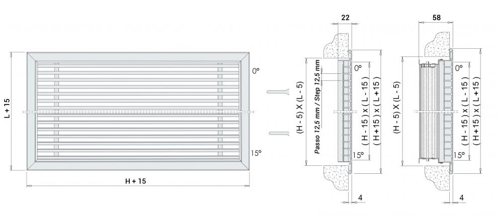 Air jets with horizontal aluminium fixed bars with 0° or 15° deflection with 15 mm frame.