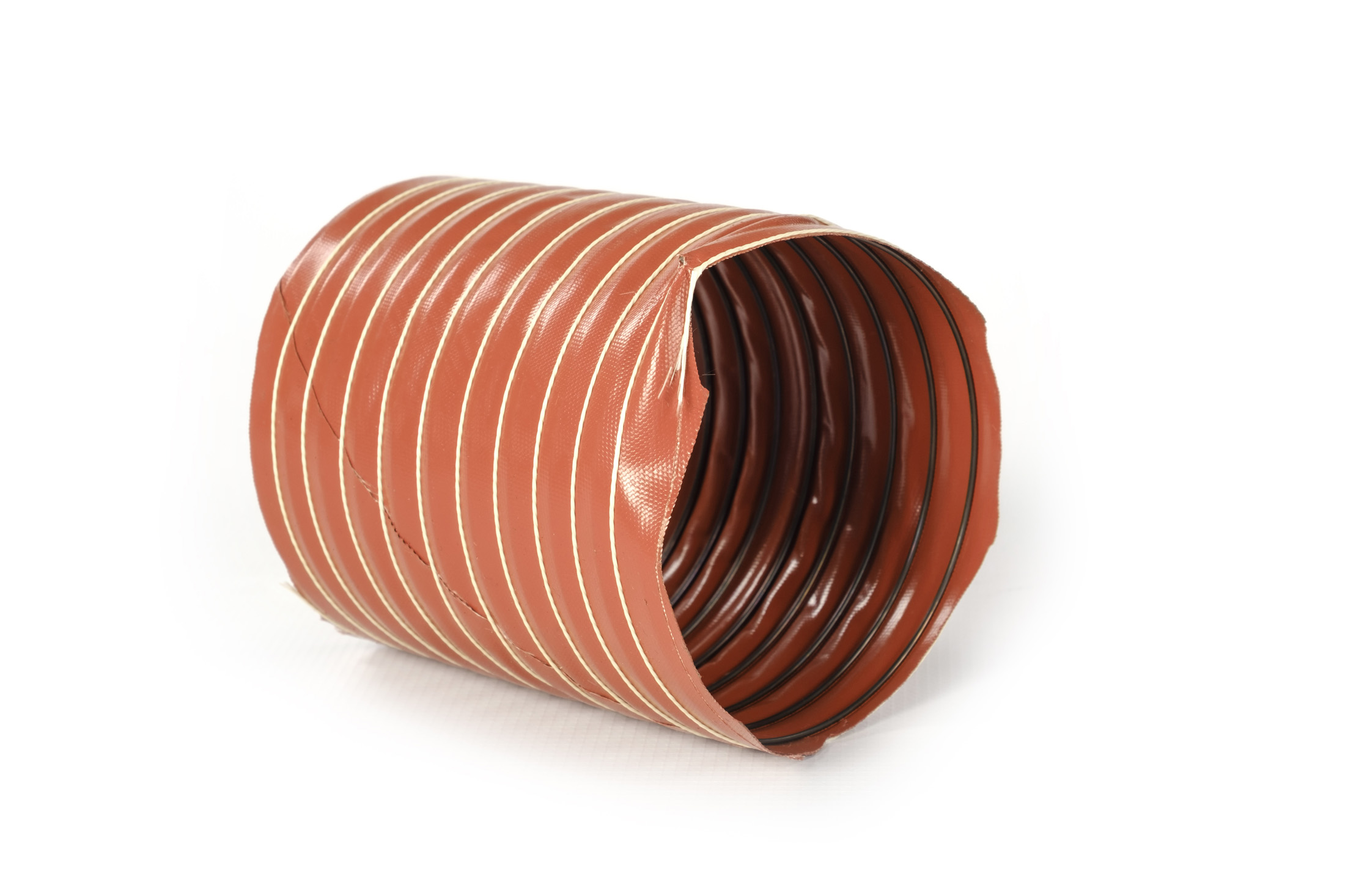 Flexible duct made of silicone coated fibreglass fabric, inner and visible copper plated steel wire helix and external fibreglass string.
