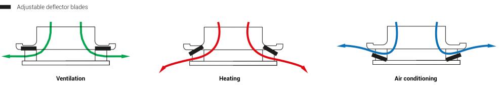 Air diffuser in white ABS with rear circular spigot, with adjustable deflectors to control the air throw on the 4 directions.