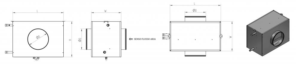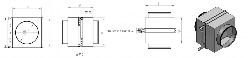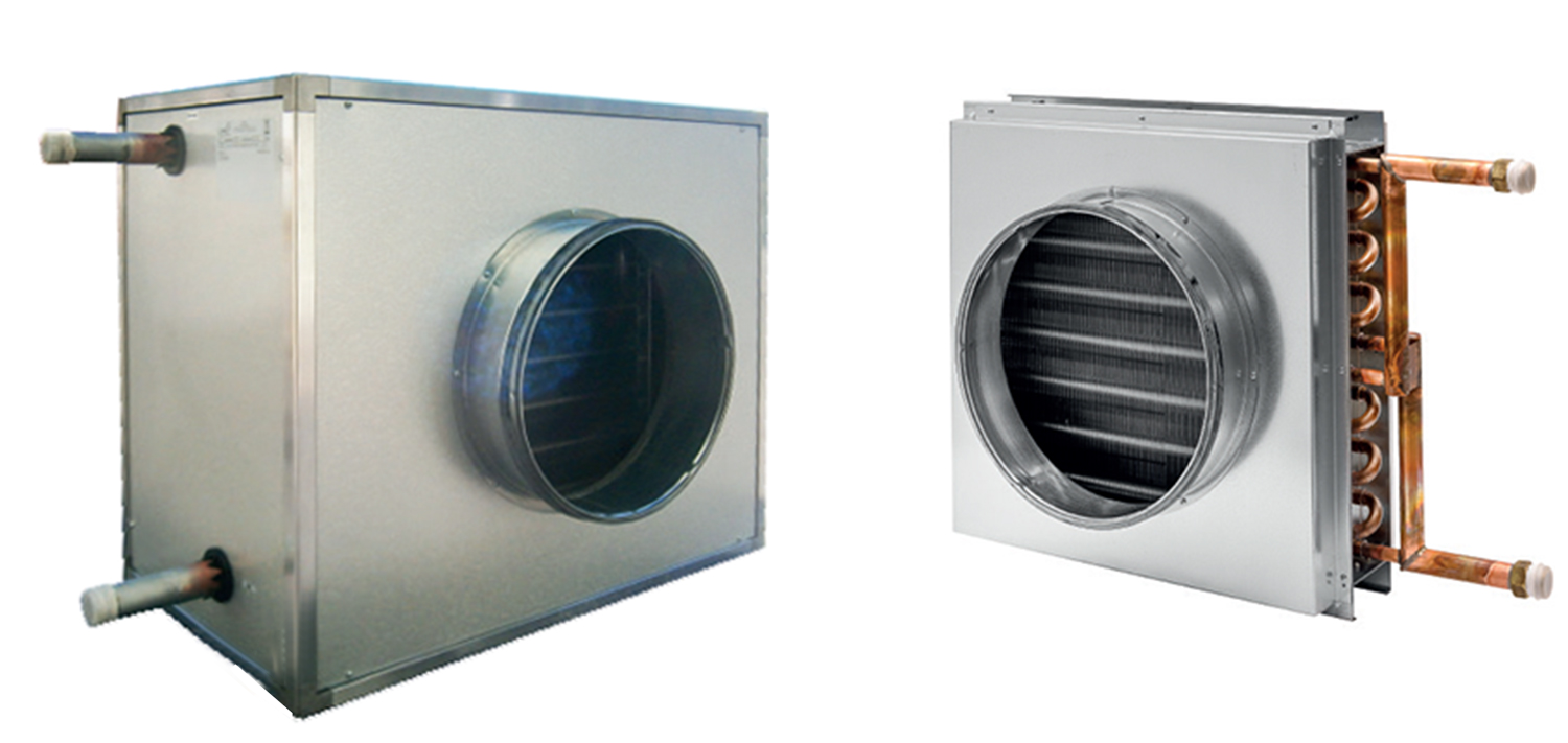 Batteria ad acqua di pre o post riscaldamento e raffrescamento costituite da telaio in lamiera zincata, tubi in rame ed alette in alluminio. Struttura dotata di attacchi aeraulici circolari maschio con o-ring per facilitare l’installazione al condotto. Attacchi idraulici filettati comprensivi di valvole per lo sfiato dell’aria e per lo scarico della batteria.