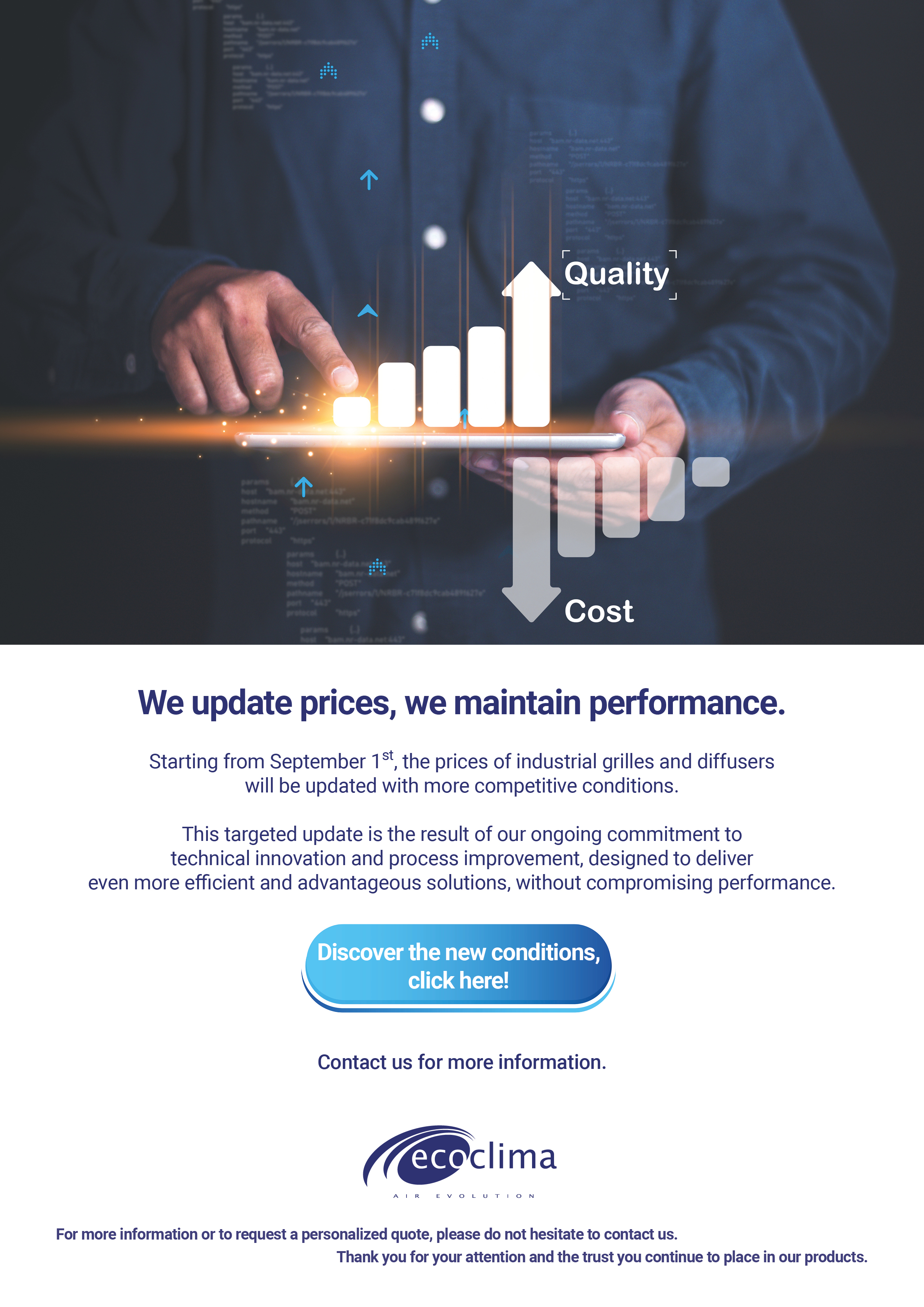 Dal 1° settembre i prezzi di griglie e bocchette industriali saranno aggiornati con condizioni più competitive. Un passo avanti frutto di innovazione e miglioramento continuo, per offrirti sempre il massimo.